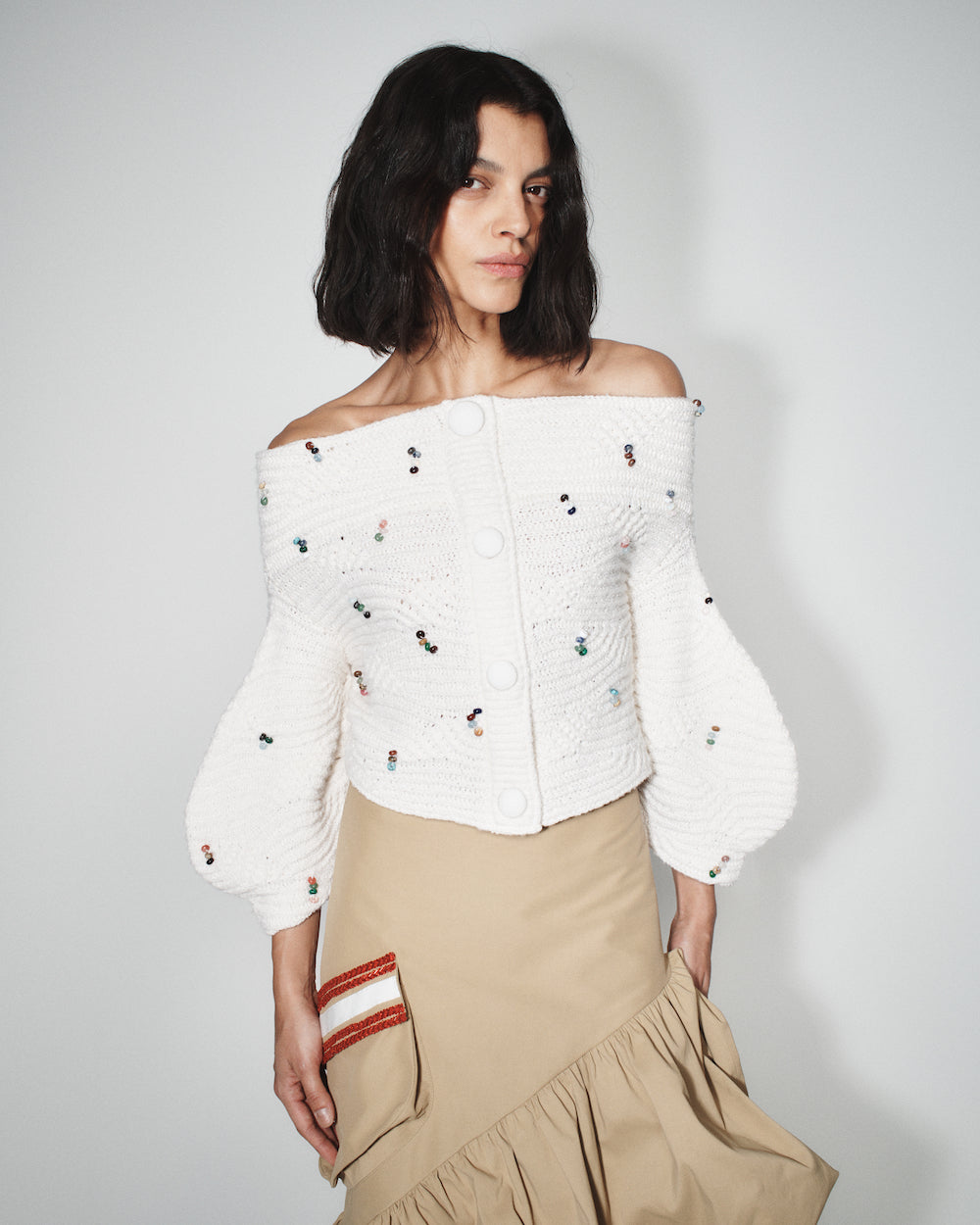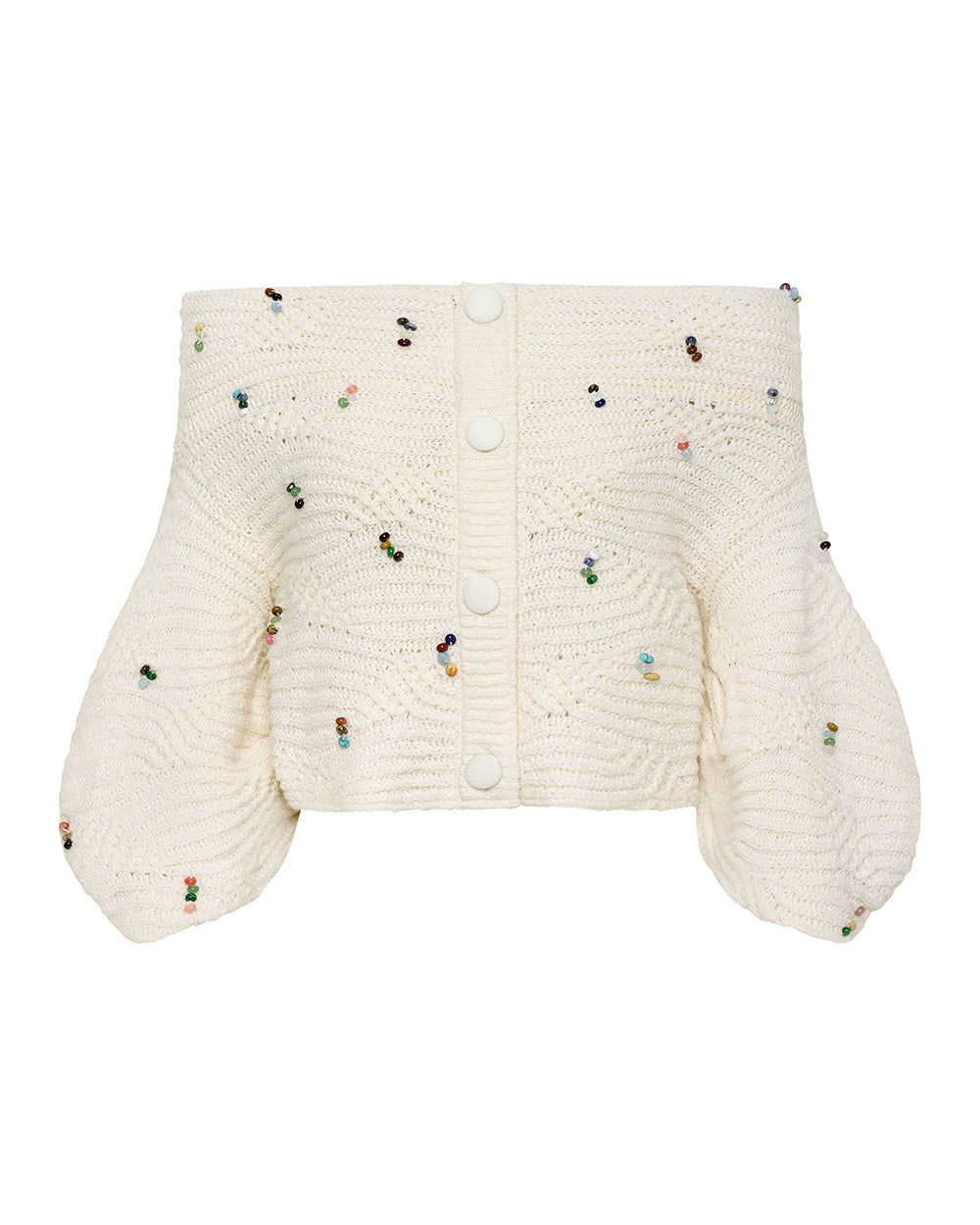 Off Shoulder Sweater with Precious Gemstone Embroidery.