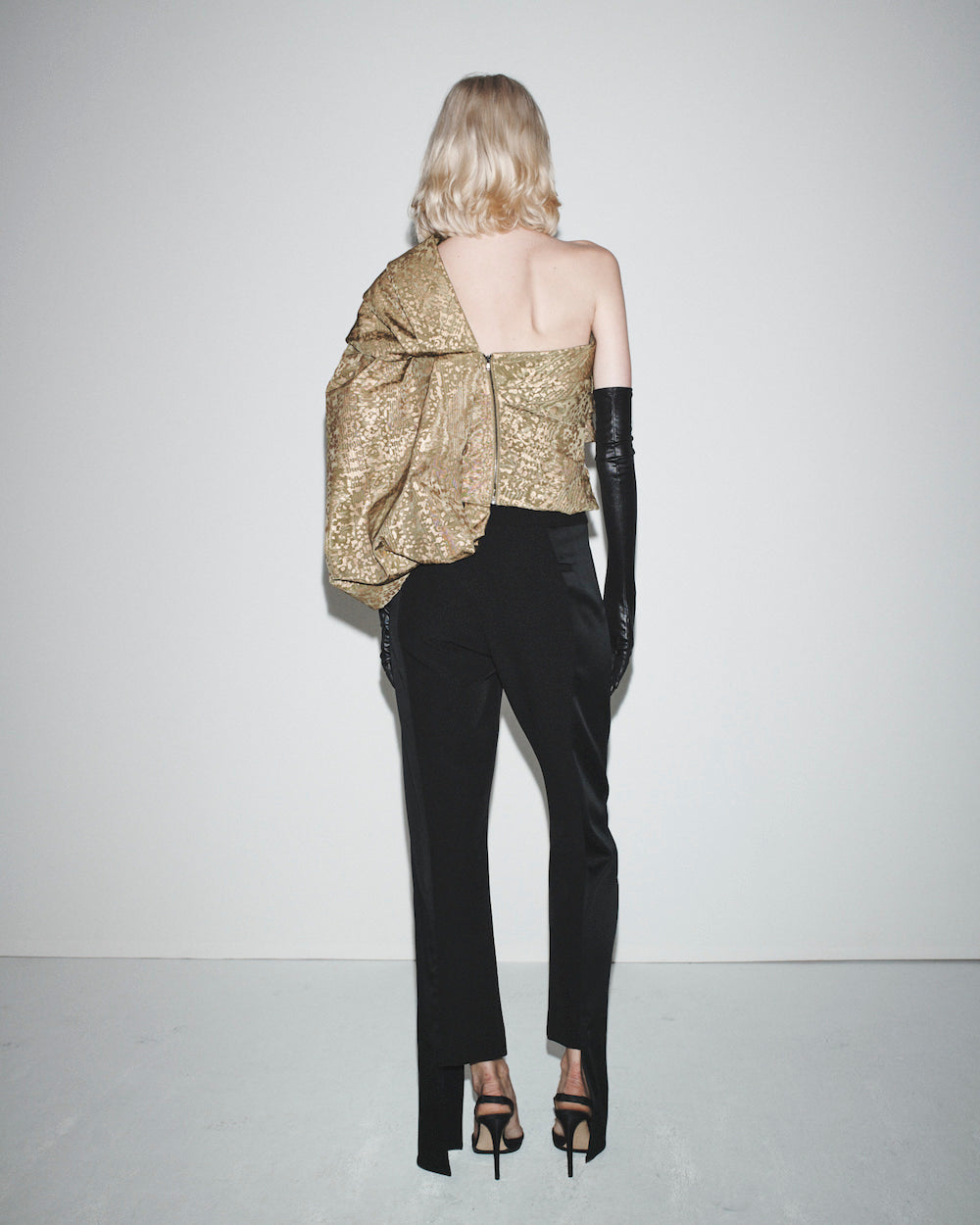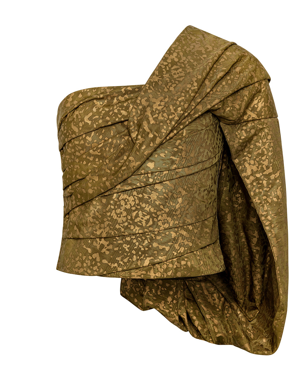 Shoulder Drape Bustier in Gold Speckled Faille.